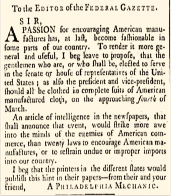 Washington himself expressed this sentiment directly, writing in 1789 that he would take pleasure in encouraging “the manufactures of my Country.”