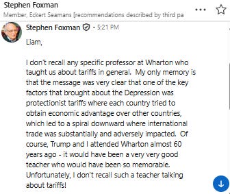 As part of my investigation into this matter, I contacted a former classmate of President Trump at Wharton, Stephen Foxman. Foxman would go on from Wharton to study at Harvard Law School, and has had a long and successful career as an attorney. Foxman has no recollection of any classes that taught about tariffs. However, he informed me that he specifically remembered being taught that the Great Depression was exacerbated by protectionist measures such as the Smoot-Hawley tariff.